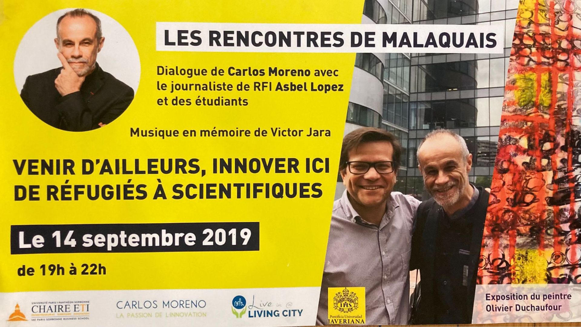 🇫🇷 Carlos Moreno participera à un dialogue avec le journaliste de RFI Asbel Lopez et des étudiants dans le cadre des Rencontres de Malaquais, sur le thème « Venir d’ailleurs, innover ici : de réfugiés à scientifiques ». Cet échange rend hommage à Victor Jara, avec un moment musical en sa mémoire. Une exposition du peintre Olivier Duchaufour sera également présentée.