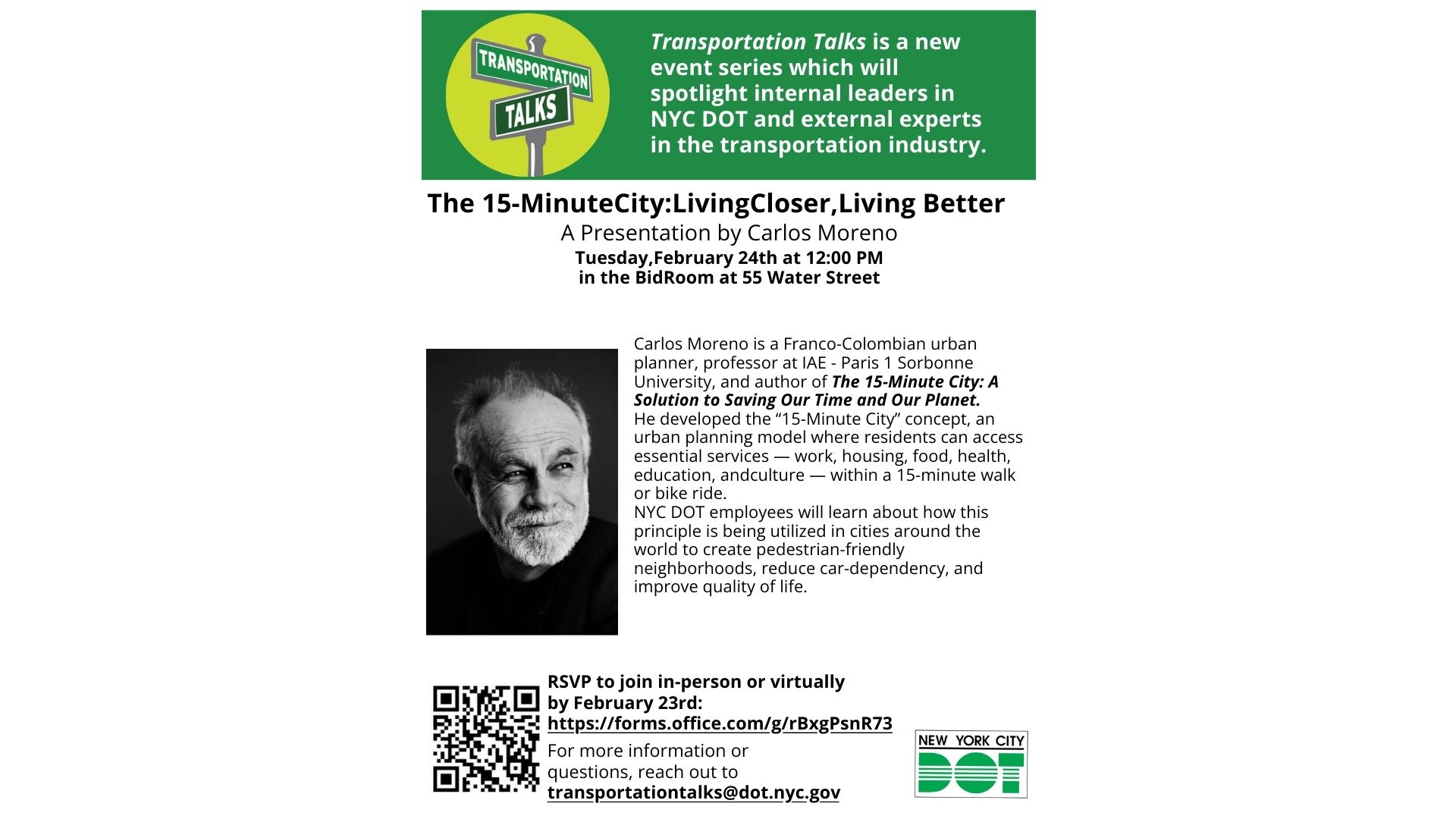 Carlos Moreno será el ponente invitado en la edición de febrero de “Transportation Talks”, la serie de eventos internos del NYC Department of Transportation, el 24 de febrero de 2026 de 12:00 a 13:00 (EST).